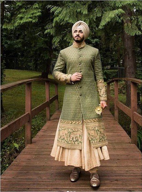 The light green colored or beige colored achkan can be worn on kurta with a flared hem. An outfit which will add a style statement on your wedding giving a vintage look is all that you need to flaunt that day.