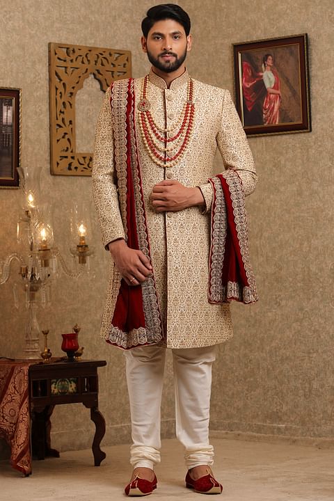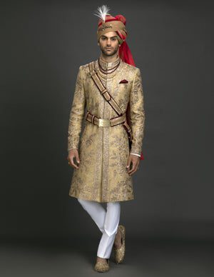 If you love experimenting new things then you can give a modern touch to your traditional wear by adding unique elements to your achkan. Having diagonal slit instead of having it on the front side, adding a brooch or a velvet trim and classy buttons is all that you can do as per your choice.