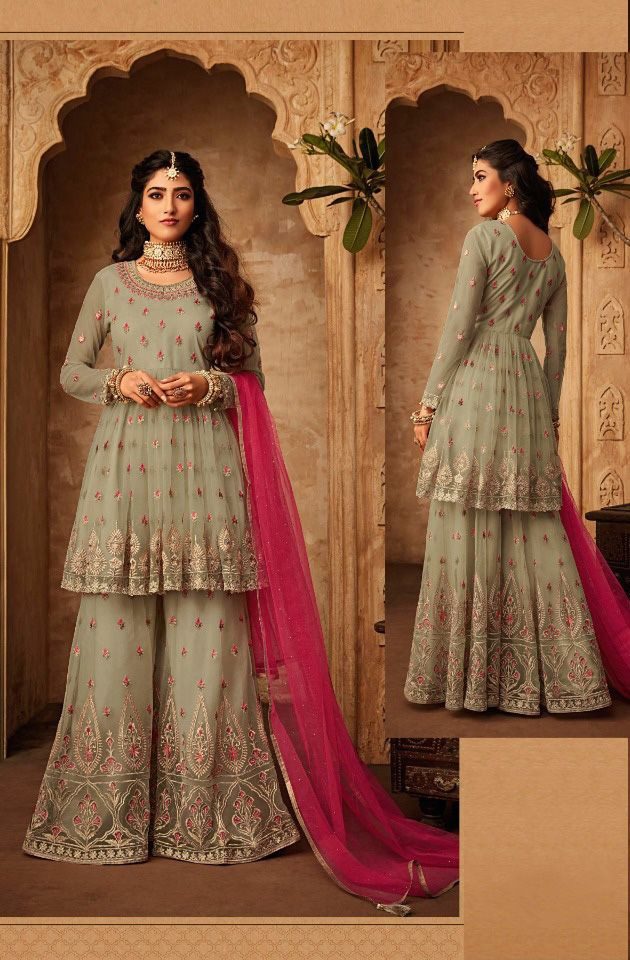 This fashion trend of Anarkali Suits originated from the Mughal times and is still in fashion in today’s world. They are available in various colours, designs, patterns. They are available in silk and georgette with printed work, sequins, Kundan work, zardosi work or embroidery designs giving a fabulous look. They can be paired with a matching or a contrast dupatta. You can pair it with leggings, pallazos or pants which will give a perfect combination for any occasion. Heavy jewelry, high wedges and a clutch goes well with this outfit.