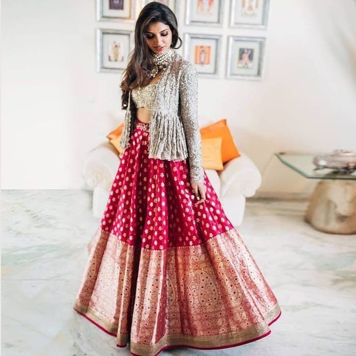 The combination of a jacket with a voluminous flowing lehenga looks amazing for any Indian occasion. The jacket lehenga is designed with embroidery work or zardosi, stone, beads work making the entire outfit look unique with modern touch. The jacket lehenga are available in various cuts, designs, lush fabrics and vibrant colors. High heels, big earrings goes well with this wear giving a bold and beautiful look.